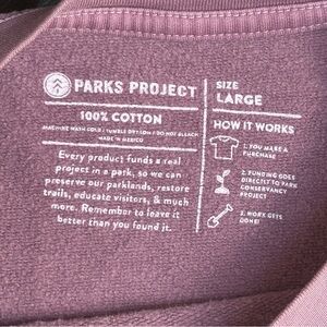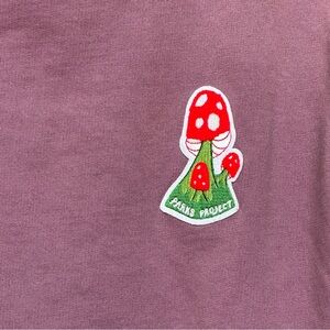 Keywords: Parks Project, mushroom patch sweatshirt, cropped crewneck, purple sweatshirt, 100% cotton, long sleeve, casual pullover, size large, eco-friendly brand