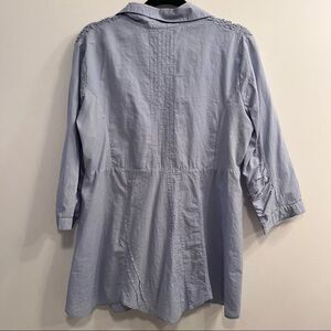 Pre owned button down, mixed metal, perforated detail top. Light blue/grey colored. Such amazing details throughout the blouse! Ruching on sleeves, asymmetrical hem line 100% cotton