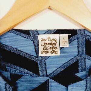 Parsley & Sage, Large, Blue Chevron Top/Wrap, Long Sleeve, Leight Weight, 100 %Cotton. This very soft top has a single front button (that actually snaps closed). Great Layering Piece. Denim blue and navy chevron print, full, flouncy body. A frayed detail in the fabric is part of the garment design, see photos. Material: 100% cotton Measurements: Underarm to Underarm: 22 Inches Collar Seam to Shoulder Seam: 4.5 Inches Shoulder Seam to Sleeve End: 22 1/4 Inches Width at front bottom with button snapped closed: 24 1/2 Inches Length Front, Collar to Bottom Front: 24 Inches Care: Machine wash cold with similar color, gentle cycle, do not bleach, tumble dry low, low iron when needed. Tags: Casual, Comfortable, Leight Weight, Layering Piece, Transitional Piece, Cotton, Chevron, Boho