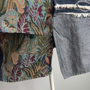 Adorned with a patchwork of denim and tapestry with fringe details and decorative buttons.