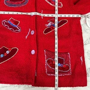 Parsley & Sage Red Hat Society Applique Jacket Button Front Long Sleeve Large. This is so fun!! You will be sure to attract attention in this quirky jacket. Fully lined and does have pockets. The hats are all different styles sizes and textures with materials, such as velvet