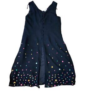 Description: Sleeveless Midi Tunic-Vest Top/Beach Cover-up with Covered Buttons on Top and V-Neck, Side Slits and Front Slit featuring Colorful "Confetti" Mirror Beads Scattered on the Lower Front. Would be cute with a tank top and slim pants underneath or over a simple black tank dress or wear it as a chic swimsuit cover up.