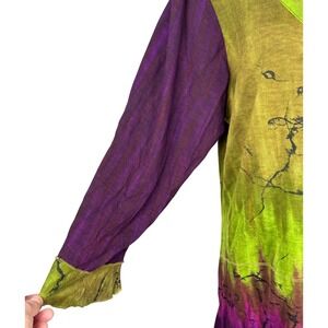 Unique Parsley & Sage tunic top displaying vibrant artistry. This long-sleeve tunic features a V-neckline and a captivating blend of purple and green tie-dye patterns. The patchwork design adds a bohemian flair, while the comfortable fabric ensures a relaxed fit. This tunic is a statement piece that effortlessly combines comfort and style.