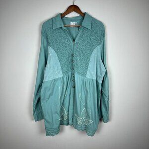 Parsley & Sage Tunic Top Womens 2X Green Blue Mixed Media Embroidered Button Up