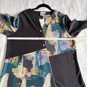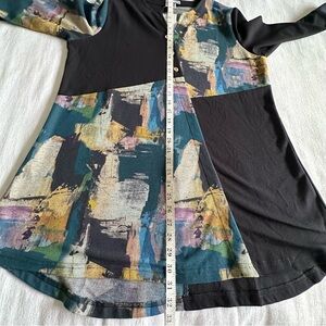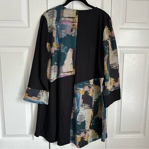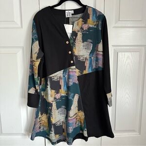 Parsley & Sage Tunic Top Womens Large Black Multicolor Abstract Artsy Boho Lagenlook Button Detail NWT