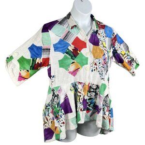 Parsley & Sage Womens Size XL Bohemian Patchwork Ruffle Hi Lo Blouse Roll Tab Sleeve Artsy Art To Wear Boho Top