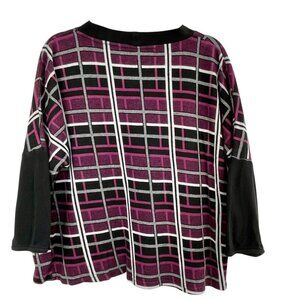 This boxy, plaid, cotton blend pullover sweater from Parsley & Sage features a ballet neck and 3/4 length dolman sleeves, and contrasting black cuffs with elastic closure. The cotton & rayon blend knit features an abstract plaid design in purple, black and gray. This pullover sweater is soft and lightweight, and cut with a relaxed, boxy shape. A cozy and comfortable sweater with contemporary and chic flair. Conveniently machine washable and dryable.