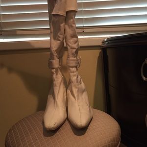 These are beautiful white boots with buttons and a buckle. They are worn therefore have a small peel in the back right boot.