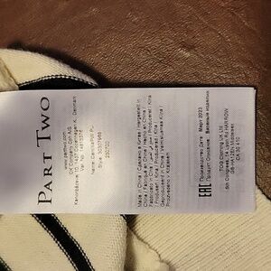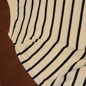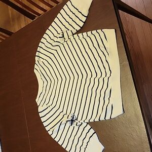 cream and black striped cotton sweater. V neck. slight gather at Sleeve by shoulder and cuff. 3/4 length sleeve. very soft.