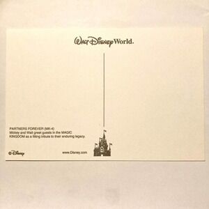Vintage 4x6 inch postcard. The front depicts the statue of Walt Disney and Mickey Mouse in Magic Kingdom, its plaque reading "Partners: 'We believe in our idea: a family park were parents and children could have fun - together.' Walt Disney" The back is empty of writing and postage, and reads "Partners Forever (MK-4) -- Mickey and Walt greet guests in the MAGIC KINGDOM as a fitting tribute to their enduring legacy."