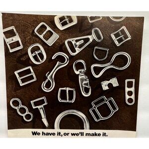 This original 1970 advertisement offers a nostalgic glimpse into Partrade’s masterful craftsmanship in leather hardware and outdoor products. Featuring timeless buckles, hooks, and fittings in various metallic finishes, it highlights high-quality materials like stainless steel and polished zinc. A perfect addition for enthusiasts of vintage outdoor craftsmanship.