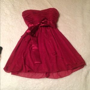 Red, slight sparkle (not very noticeable), removable tie around waist, strapless with elastic hold, size 5. Tags: prom homecoming dance dress party short