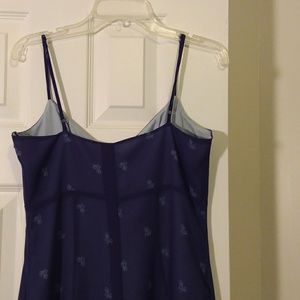 Esprit dress. Color is cornflower (purplish-blue) w/pale flowers and sprinkling of sequins along lower portion. Would be perfect w/silver heels. Fully lined. Side zipper and slits. Two adjustable straps plus 2 hidden hanger straps.