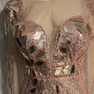 Beautiful champagne color sequenc, long sleeve mini mesh dress . Very elegant and a show stopper with rhinestone details