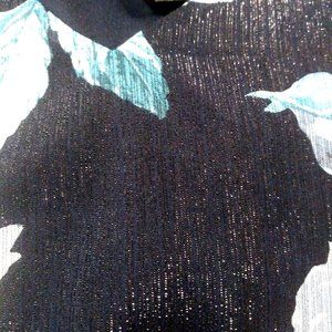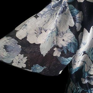Listed for Sale is a Vintage Floral Embellished Dress. The dress features a Shiny Material, V-Neck, Batwing Sleeves, a Rhinestone Banded Elastic Waist, Half Lining and a Full Skirt. It is in excellent condition.