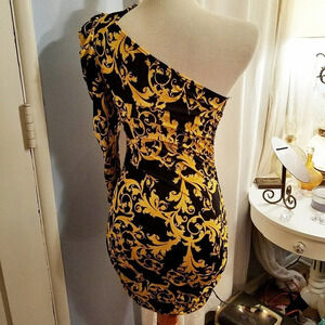 One Shoulder Dress | Slinky Frock | Yellow & Navy | Size Small