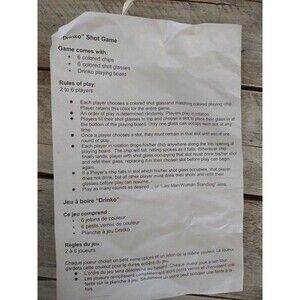 Gather your buddies and get ready for the ultimate party game: Elements Drinko! Each set comes with six shot glasses, a playing board with an acrylic cover for added protection, and brightly-colored chips. Instructions are included so everyone can get the game going in no time. Pre-owned. In good condition, box has some light soil.