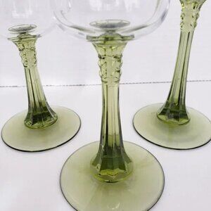 This a lovely set of 3 Radiant Glow Votive Holders by PartyLite. These holders feature a olive green glass stem and base with a clear glass bowl. This are beautiful and will add a touch of elegance to any setting
