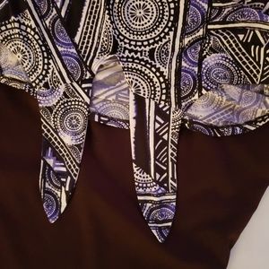Sweet purple/white/ black casual top. Poly blend. Round neck, cut-to-tie knot at bottom front. VERY cute and comfy. Looks great with black jeans !!! Excellent condition.