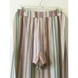 Shorts with open skirt wrap pastel vertical stripes ties front or back hidden zipper. There is no size tag. I used a size chart to come up with a size 10. Please check measurements.