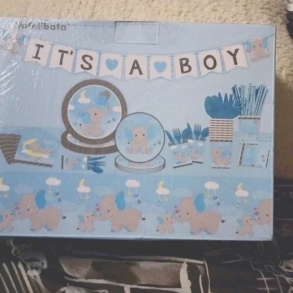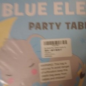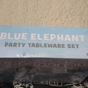 Part tableware set for baby shower. This set serves 20. The theme is for a boy. Set comes complete with (9") plates, (7") plates, napkins, (8 oz) cups, cutlery bags, knives, forks, spoons, paper straws, table cover, (88"x42") and 1 Pre-assembled Blue Elephant Banner
