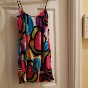 Multi colored spaghetti strap, empire waisted balloon tank. 22" from top of bust to bottom of hem. 12" wide at empire waist.