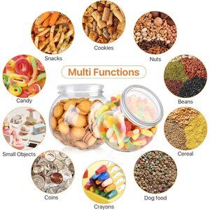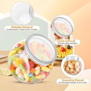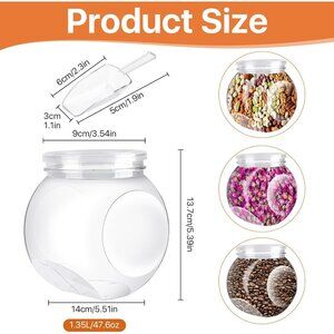 Brand new in box Party Time set of 4 plastic rounded 47.60oz candy jars come with lids and scoops and is a practical and festive addition to any party or buffet table. These clear plastic jars feature a round shape and a generous capacity of 47.60 oz, making them perfect for storing and serving candies or other snacks. Each jar comes with a coordinating lid and scoop, ensuring easy access and portion control. These durable and stylish containers are sure to add a touch of fun to your next gathering, packaged and shipped priority with care.