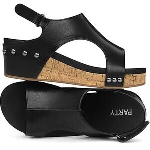 Party Womens Size 7 Black Faux Leather Hook Loop Strap 2" Cork Platform Sandals
