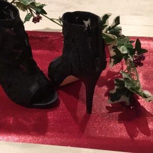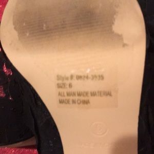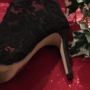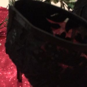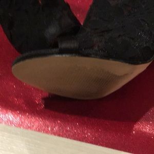 Gently used Beautiful black lace flowered pattern with just enough sequins to add a little sparkle to your holiday outfit. Open toe, back zip with 4” heel. Hurt my back so can’t wear anymore. ☹️