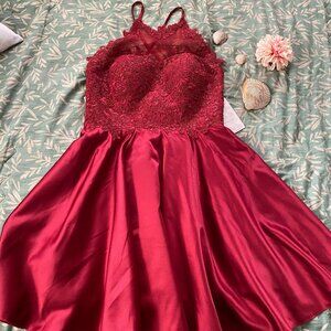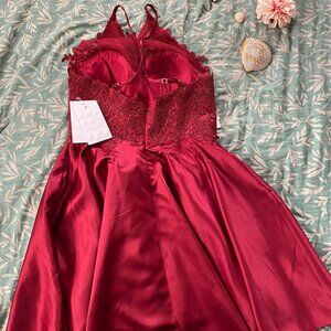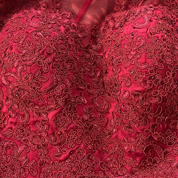 It's a very pretty dress, in perfect condition, it has foam padding on the breasts, the size is small, it has small black glitter, the fabric is satin or silk, it has a little volume at the bottom and embroidery on the top, the color is wine