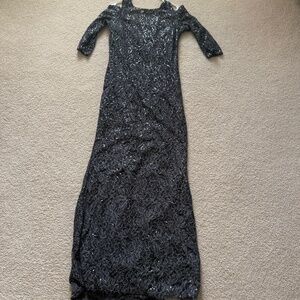 Floor length, dark grey sequined evening gown. It has three quarter length sleeves with cold-shoulder cutouts. Body hugging silhouette with a slightly scooped neckline.
