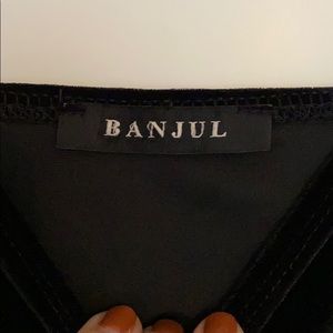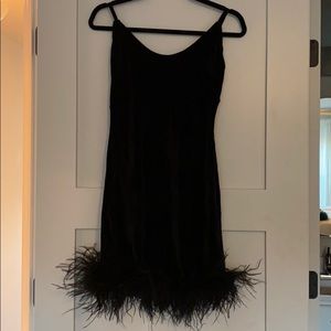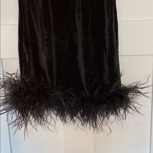 Black velvet, feather detail, no zipper, slight stretch but defiantly a mini dress! Fun for a holiday party!