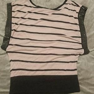 Nice quality light pink and dark grey shirt with rhinestones on the sleeves... All intact...worn only a couple of times.