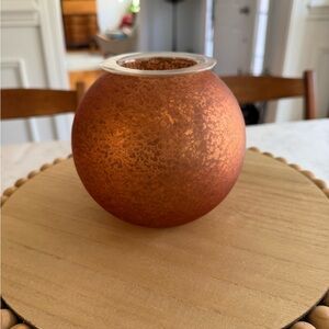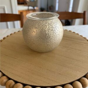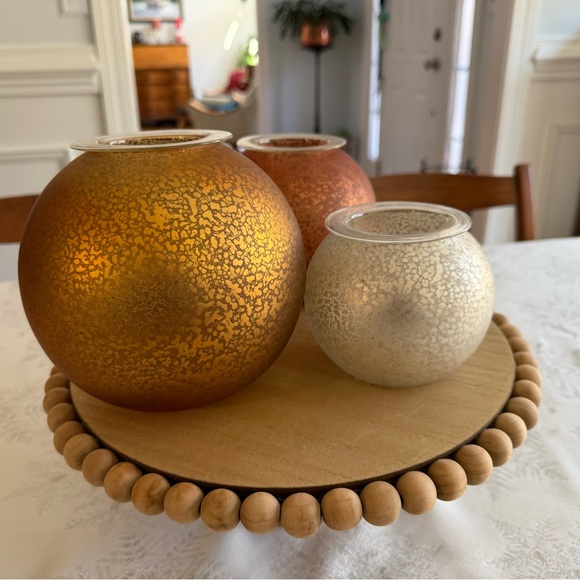 Enhance your home decor with these elegant gold, amber and cream glass rounded tea light candle holders. Perfect for adding a touch of sophistication to any room. With a candle placed inside these holders glow beautifully. One holder does have some wax “overflow” and one with a flame burn mark, which should wash out easily.