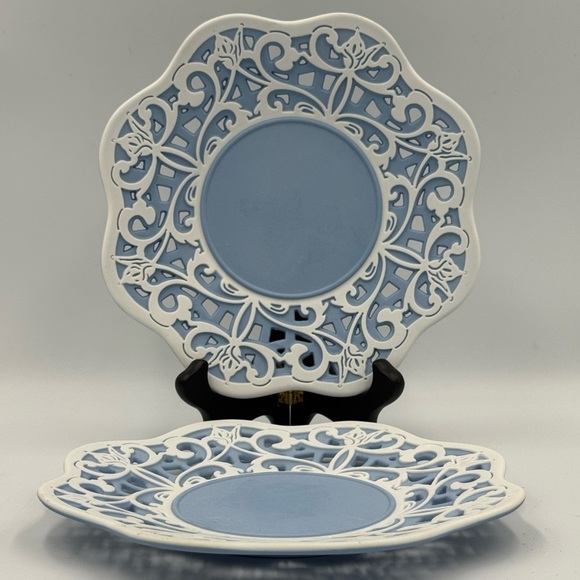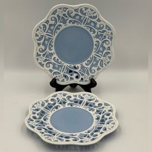 7” decorative plates featuring a blue center and a white, intricate, cut-out lace-like border with a floral design RETIRED design. Set of 2 In good condition. No chips or cracks.