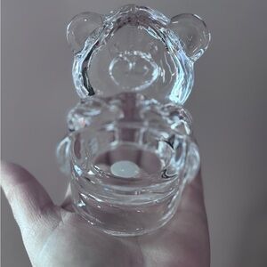 Charming vintage clear glass bear candle holder. For tealight only. Detailed stitching on bear’s paws and tummy. 4 inches tall. Never used. In original box. 1995.