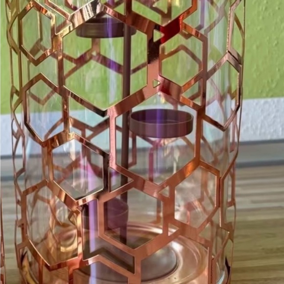 Stylish copper honeycomb hurricane candle holder. Excellent condition.