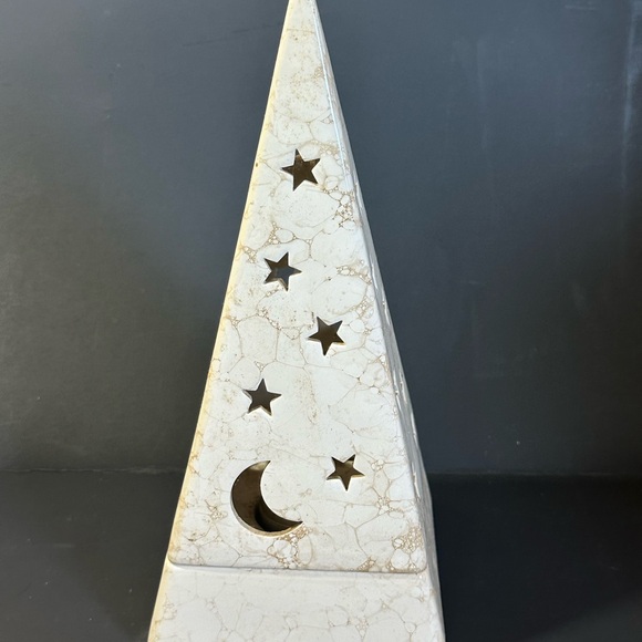 Elegant cream candle holder with star and moon cutouts. Perfect for adding a celestial touch to any room.