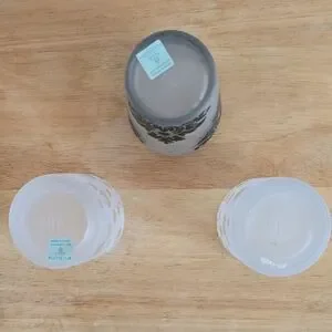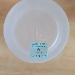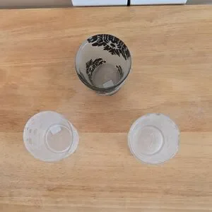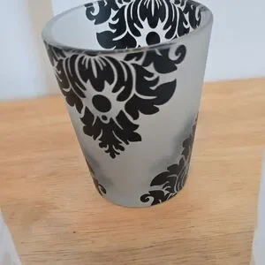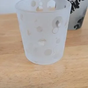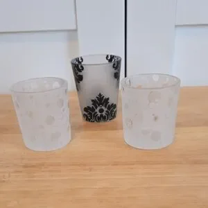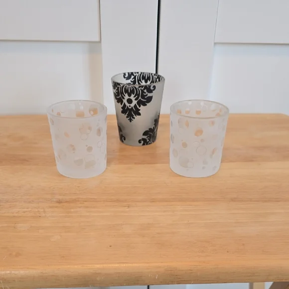 Three PartyLite frosted glass votive holders. Two holders display a subtle frosted white polka dot pattern. One holder features a bold black damask design over frosted glass. Creates gentle, decorative candlelight for tabletops.