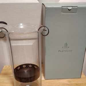 Elegant glass hurricane holder by PartyLite. Features a warm tan candle. Perfect for adding charm to any space.
