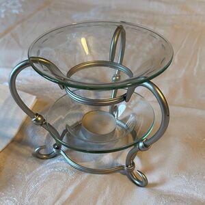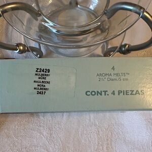 Elegant glass and brushed silver design. Top glass tray has a dot dash design on the rim. Perfect for adding a touch of class to any space. Ideal for creating a cozy ambiance. Comes with 4 Mulberry scented PartyLite aroma melts. Used once. Comes with original information brochure.