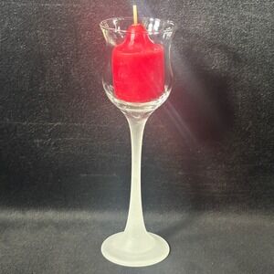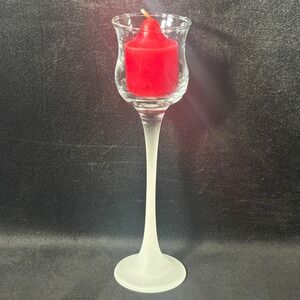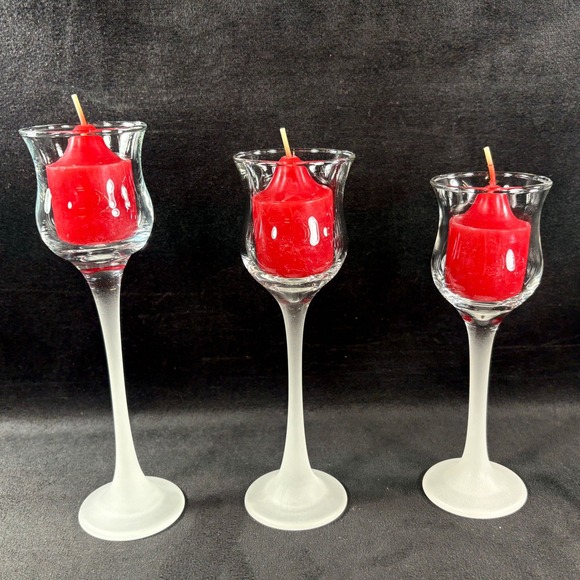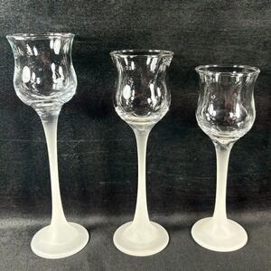 This PartyLite Iced Crystal Stemmed Trio Set of Glass Votives including candles is in excellent condition. It features 3 clear holders with frosted stems at 3 different heights 7 1/2", 7", and 6 1/2".