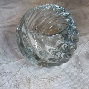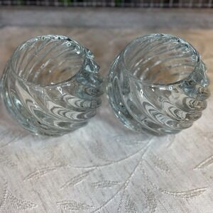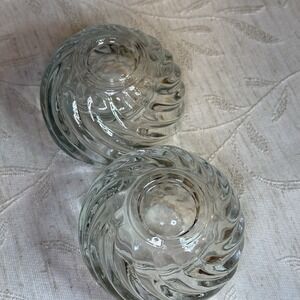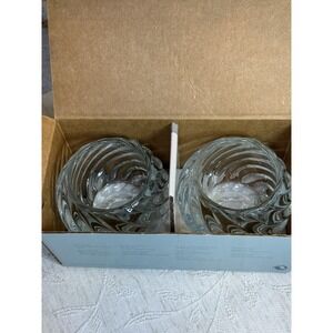 The PartyLite Illusions Set of 2 Sturdy Glass Swirled Candle Holders is a retired collectible featuring a modern and romantic design. Made of clear glass with a shiny finish, these small round candle holders have a swirl pattern that adds a touch of elegance to any home decor. Suitable for votive candles, this set is perfect for adults looking to add a touch of romance to their space. With a set of 2, these candle holders are ideal for creating a warm and inviting atmosphere. Pre-owned, in original opened box. 3"x3" holds votives and tea lights. No visible chips or cracks. Likely from early 2000's