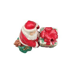 Jolly Santa votive holder with hinged lid on the present. Decorated with holly leaves and berries.