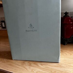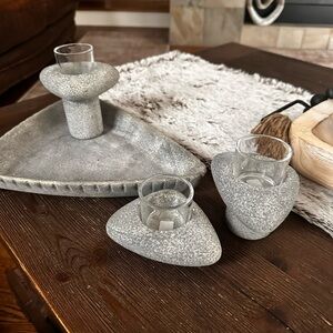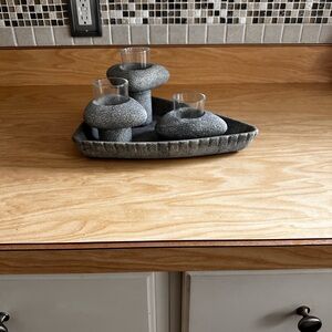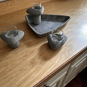 Textured gray surface with three separate candle holders made by PartyLite branding. Unique decorative item. Item is new never used stored in basement and is a retired item. In original box