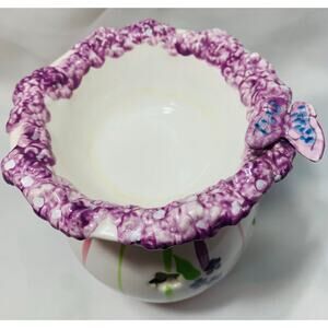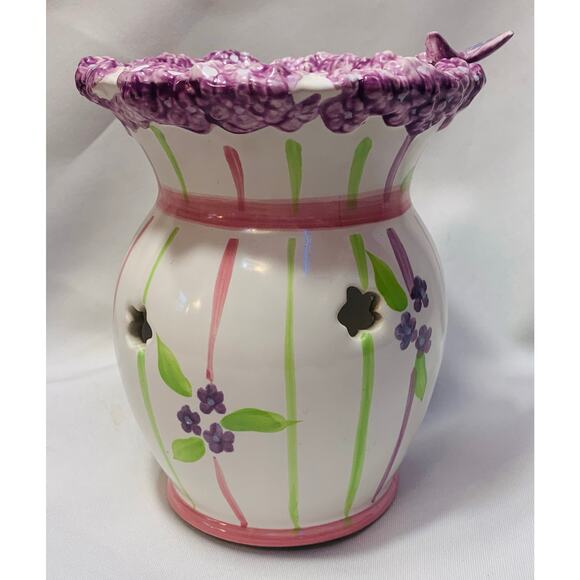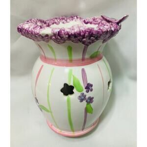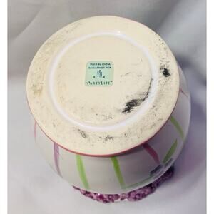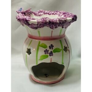 PartyLite Meadow’s ceramic wax melt warmer features a white ceramic base with pink and green stripes purple flowers and a butterfly design perfect to add spring in any room in your home. The top rim has textured purple lilac flower design This warmer is meant to be used with a tealight candle placed in the bottom (there is a mark from previous use see picture) This item is approximately 5.5” tall and is used good condition ready for your home!