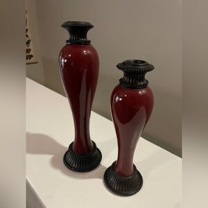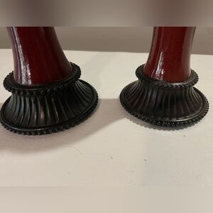 PartyLite Moroccan Spice taper candle holders. These items are a retired product line from the brand PartyLite and are made of ceramic with a glossy red or burgundy finish and a dark (often described as black or brown) ribbed base and top. Included 9 inches and 10.5 inches tall.