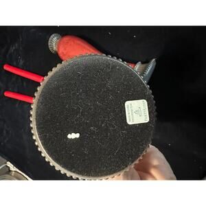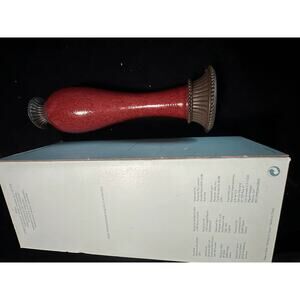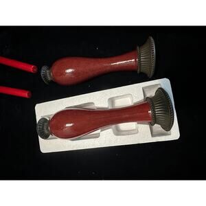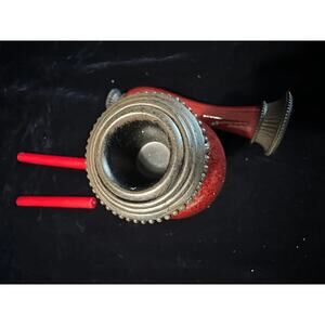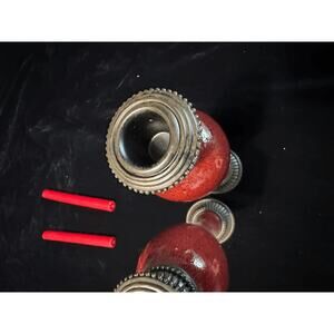 Enhance your home's ambiance with this elegant pair of PartyLite Moroccan Spice taper candle holders. This set, model P7531, features a rich red body with ornate pewter-tone metal accents at the base and top, standing at 10.5 inches tall. Perfect for holding standard taper candles, they make a stunning centerpiece for a dining table or mantle. The set comes in its original packaging and includes two red taper candles as pictured.