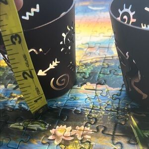Stylish metal candle holders with artistic cut-out designs. Perfect for adding a cozy glow to your space. Set of 2
