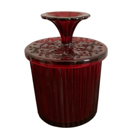 Vintage Stunning ruby red glass jar. Features a decorative lid. Ideal for adding elegance to any space.